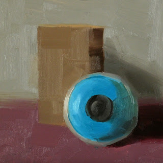Yesterday, I did two paintings. Here I just show one to you. I revisit the color blue (turquoise or cyan to be more accurate). Now I understood that I can't tint too much the tube color if I want to keep the chroma high. So this will limit my leverage of value change. Pthalo turquoise is very dark color, but I want to show lighter value, what should I do? With my first painting, I used analogous scheme, and high value background. It didn't work, because I have to tint the turquoise a lot. The color got bleached. The second painting showing here works I think. I did two things. I made background darker, so the value of blue object does not need to be too high. Secondly, I used complementary color scheme to enhance the color contrast. Even the chroma is not very high (chroma = 79, (100 is the highest)), but the complementary scheme bushes it up.